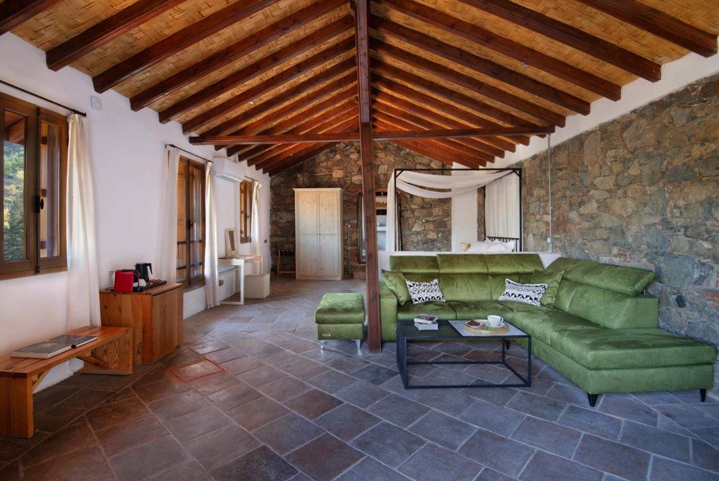 Deluxe Double Room. Fitted with Cocomat mattresses, pillows and linen, this double room has a balcony, tilemarble floor and fireplace. A Nespresso coffeeis available. Kindly note that fire logs are provided at extra charge. Kindly note that the sofa bed can be converted to a double bed. Kindly note that this is an open-plan room. ;