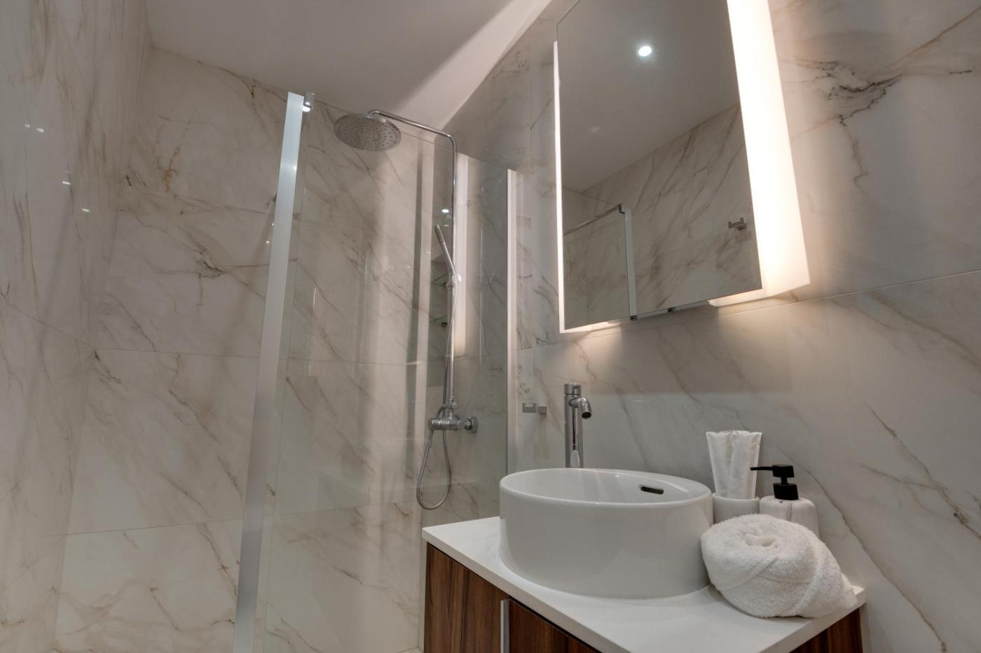 Two-Bedroom Apartment. Boasting a private entrance, this spacious apartment also includes 2 bedrooms, a seating area and 2 bathrooms with a walk-in shower and a hairdryer. Meals can be prepared in the well-fitted kitchen, which is fitted with a stovetop, a refrigerator, a dishwasher and kitchenware. The air-conditioned apartment offers a flat-screen TV, a washing machine, soundproof walls, a tea and coffee maker as well as city views. The unit has 2 beds.
