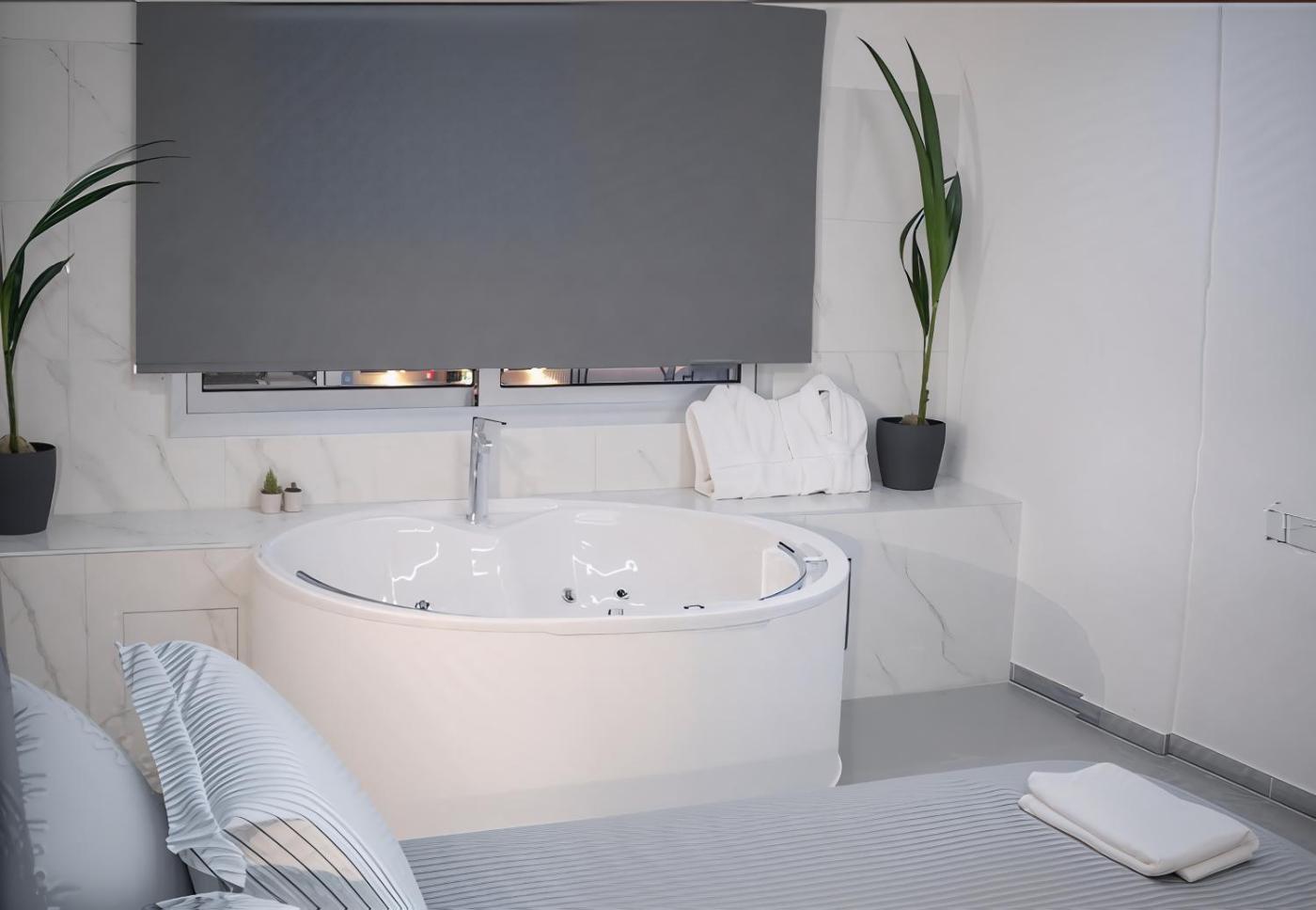 One-Bedroom Apartment. The hot tub is the standout feature of this apartment. Boasting a private entrance, this air-conditioned apartment comes with 1 living room, 1 separate bedroom and 1 bathroom with a bath and a shower. The apartments kitchenette, which has a refrigerator, is available for cooking and storing food. The apartment features a tea and coffee maker, a seating area, heating, a flat-screen TV, as well as garden views. The unit has 2 beds.