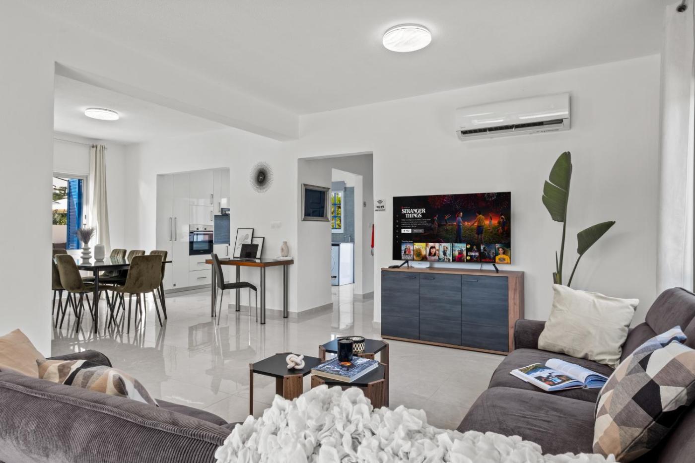 Villa. This villa provides a private pool. Featuring a private entrance, this air-conditioned villa is comprised of a kitchen, 4 bedrooms and 3 bathrooms with a walk-in shower and a bath. Meals can be prepared in the kitchen, which comes with a stovetop, a refrigerator, a dishwasher and kitchenware. Boasting a balcony with garden views, this villa also offers a washing machine and a flat-screen TV with streaming services. The unit offers 5 beds.